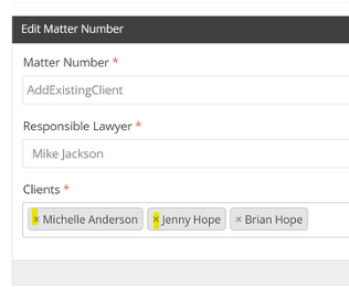 To delete the client, click on the “x” to the left of the client (highlighted in yellow in the image below) that needs to be removed from the matter.