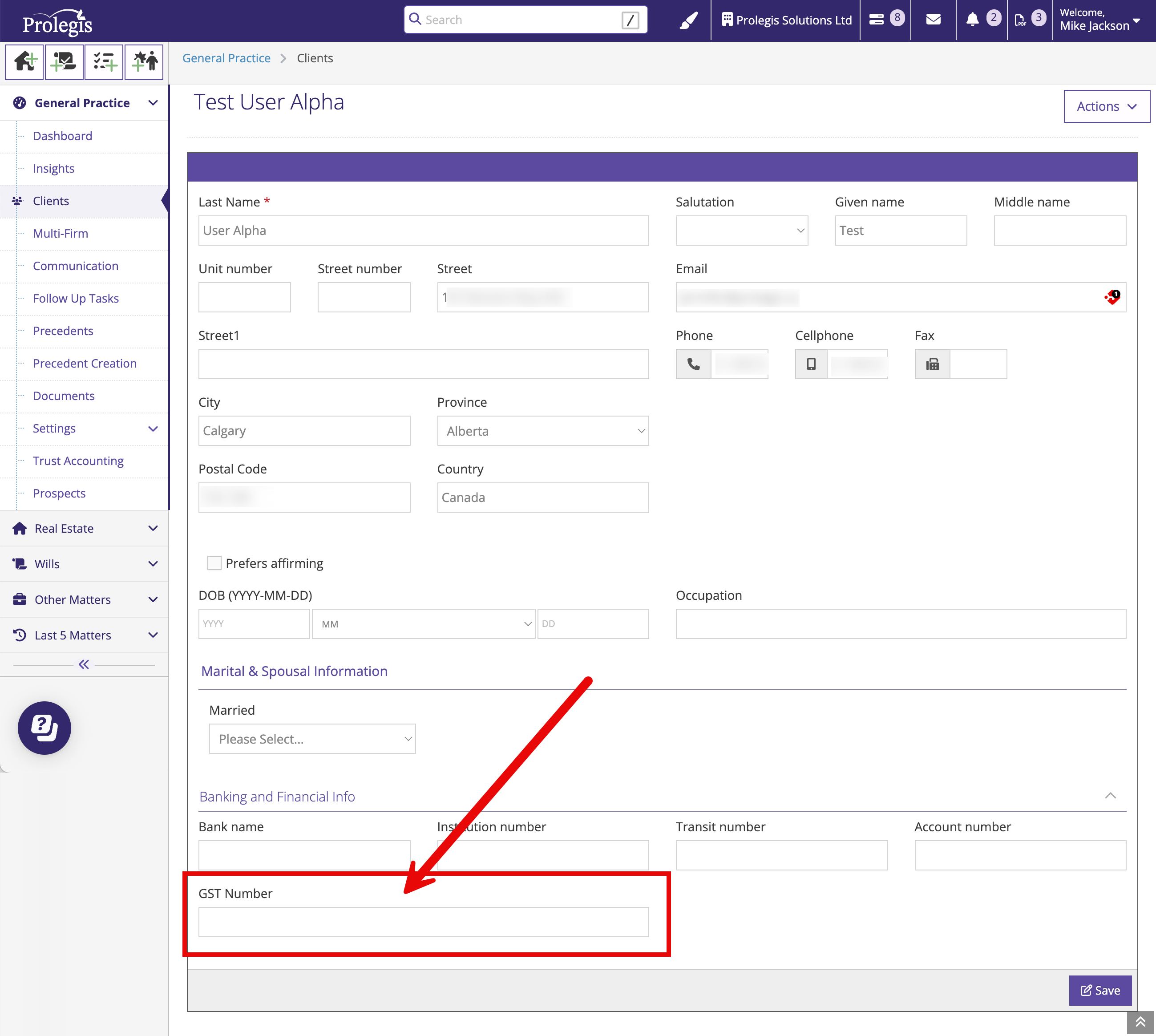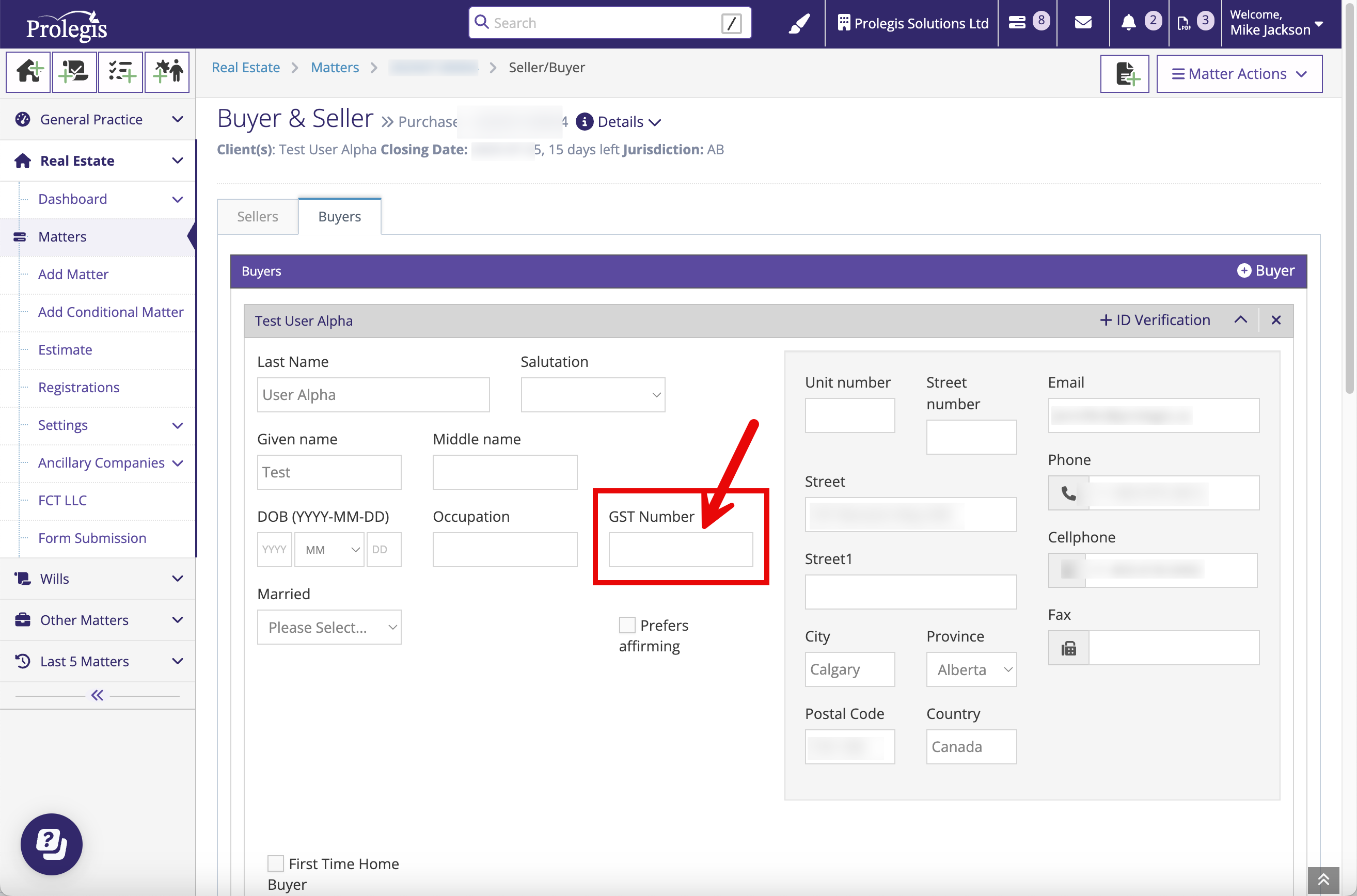 To add the GST number, go to either the Firm Client dashboard or the Seller/Buyer section of the real estate matter. Access the client record and insert the GST Number in the GST Number field.