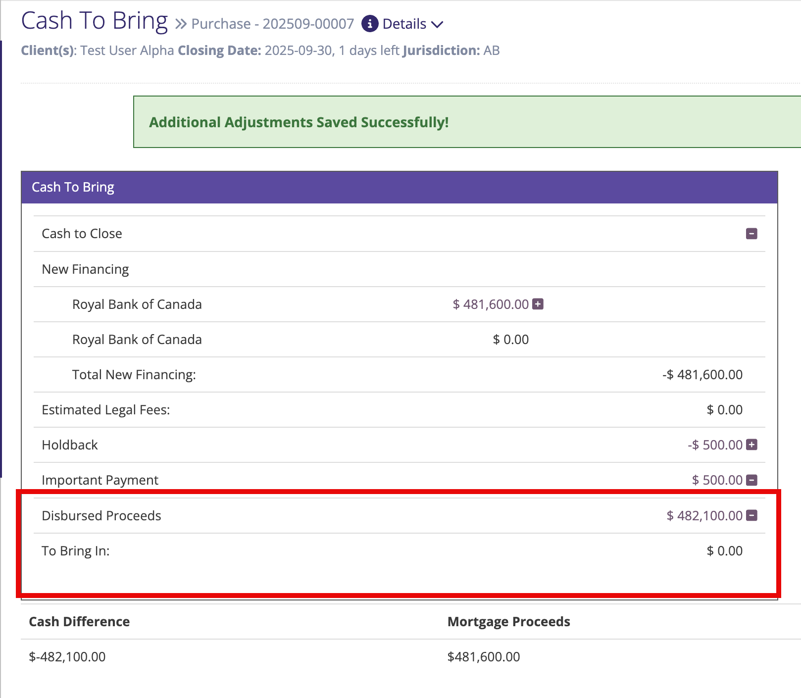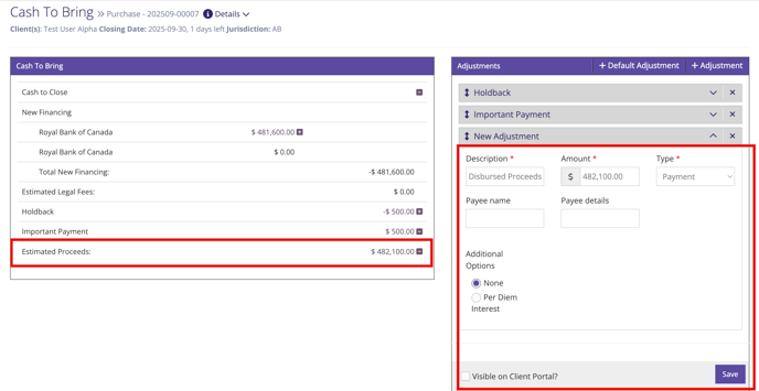 - For example, record the "Estimated Proceeds" actually disbursed to the client as an adjustment (Type "Payment")