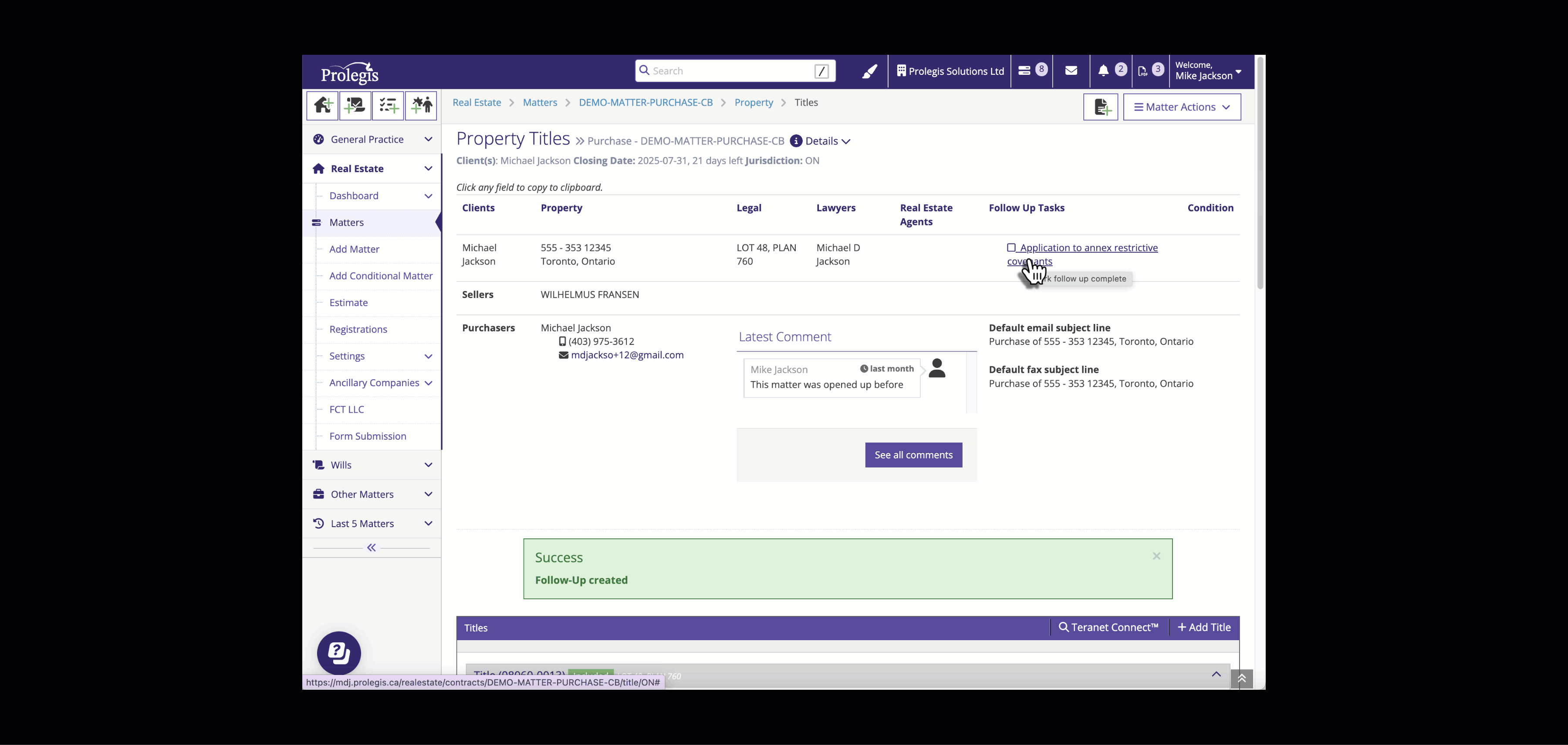 When the requisition is specifically related to an instrument registered against the parcel, to add a requisition go to Actions > Property > Titles.