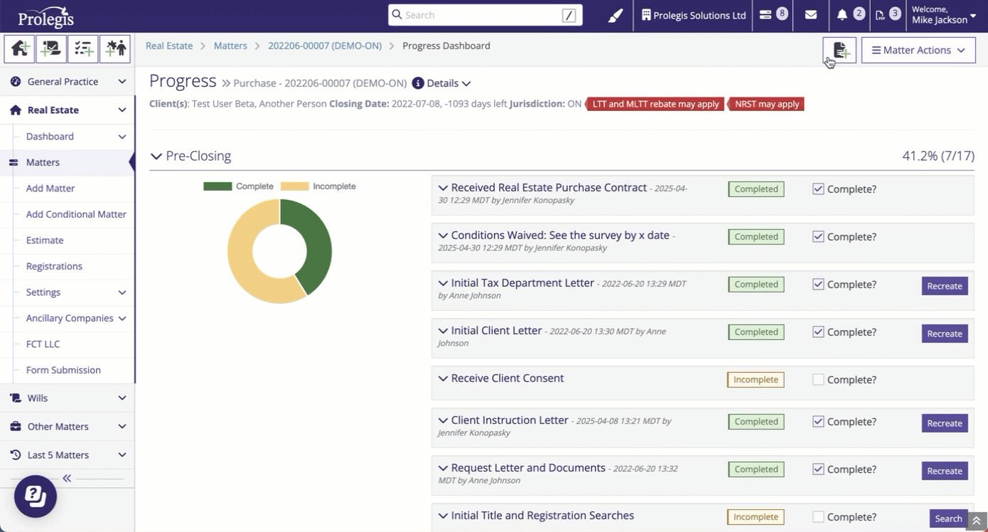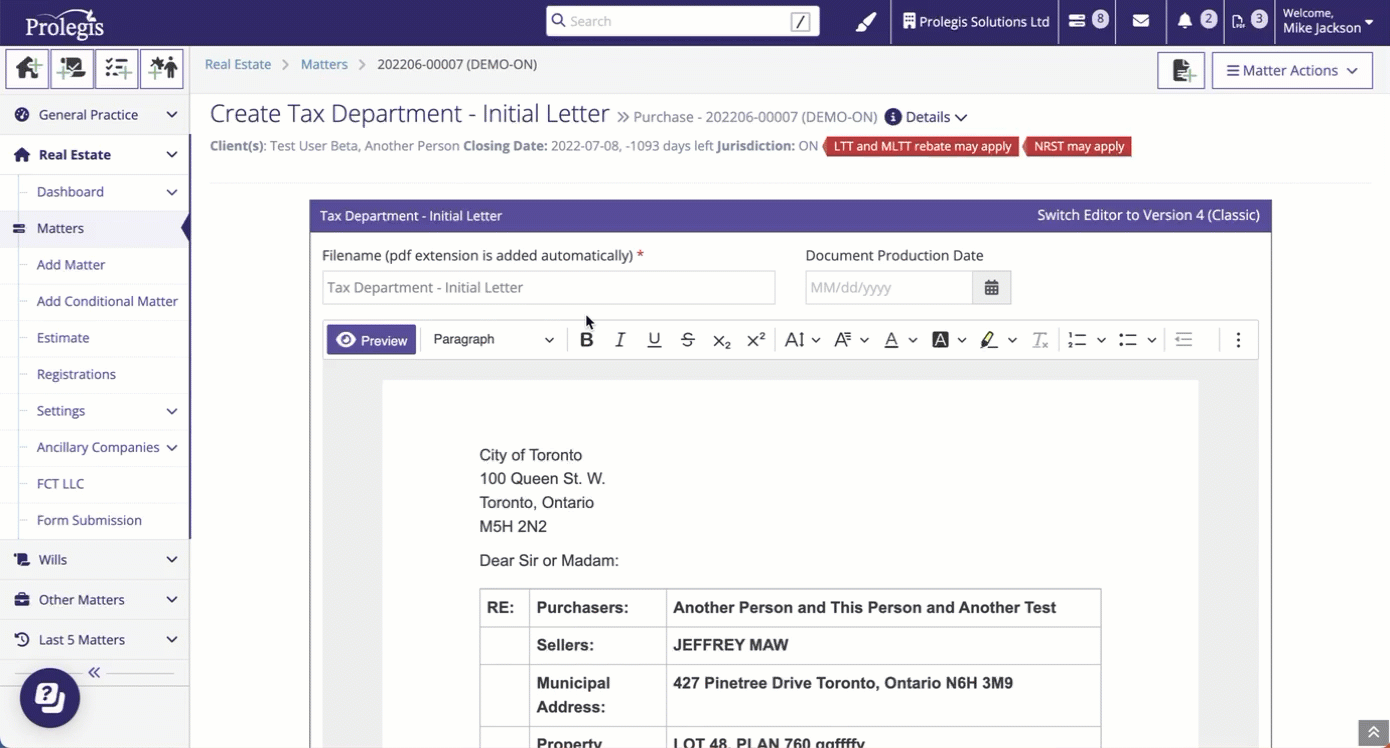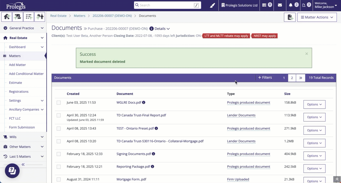 After you have completed the data entry into Prolegis, you are now ready to produce documents. You can produce documents at any stage of the process, however, the more complete your data entry, the more complete the documents will be. If you are sending an initial client letter, you likely will not need to populate the entire matter to send a fully completed letter, but if you are looking to produce the transfer documents, you will, at a minimum, want to upload the title.