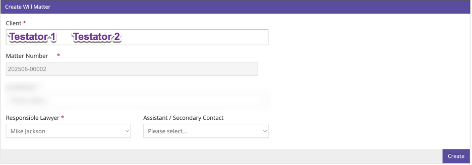 To create a mirror will in Prolegis, add two clients when creating the matter. Both clients will be added as testators.