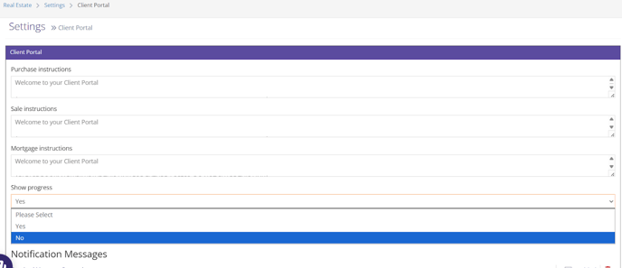 - Click “Real Estate > Settings > Client Portal” and click “No” under “Show Progress”.