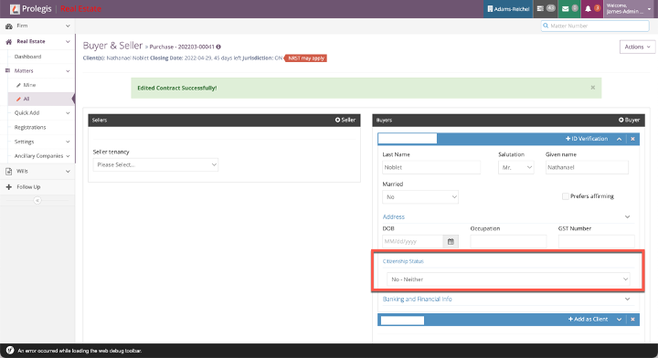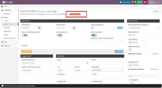 If the property is located in the Province of Ontario and the conveyancer has not indicated whether the purchasers are either Canadian citizens or permanent residents, Prolegis will alert the user that the NRST may apply.
