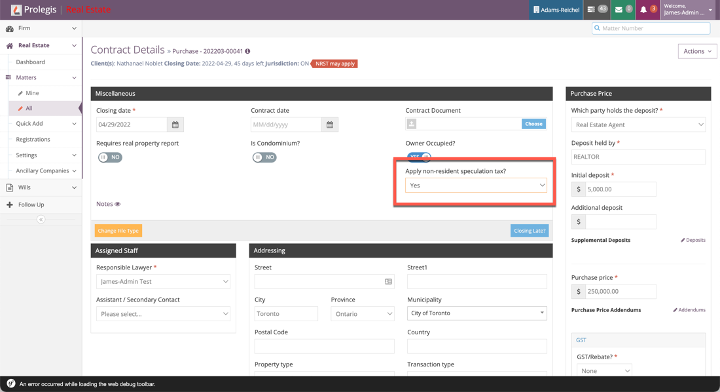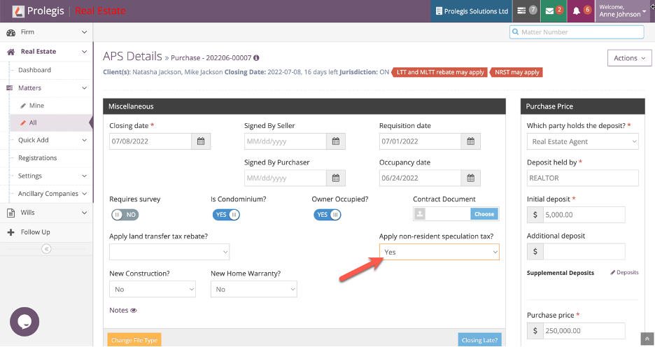 Prolegis will automatically flag that the NRST may apply to a transaction when the conveyancer has not indicated whether the buyers on the transaction are Canadian citizens, permanent residents or neither. If the conveyancer knows the NRST will apply, the conveyancer will navigate to Actions > Property > APS and select “Yes” in the Apply non-resident speculation tax field.