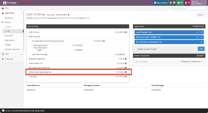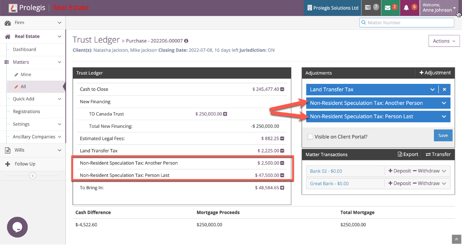 The NRST is automatically added to the Trust Ledger (Actions > Trust Ledger). The addition of this adjustment is linked to the citizenship status of the buyers. The addition or removal of this adjustment is based on whether or not the person is a Canadian citizen/permanent resident or neither.