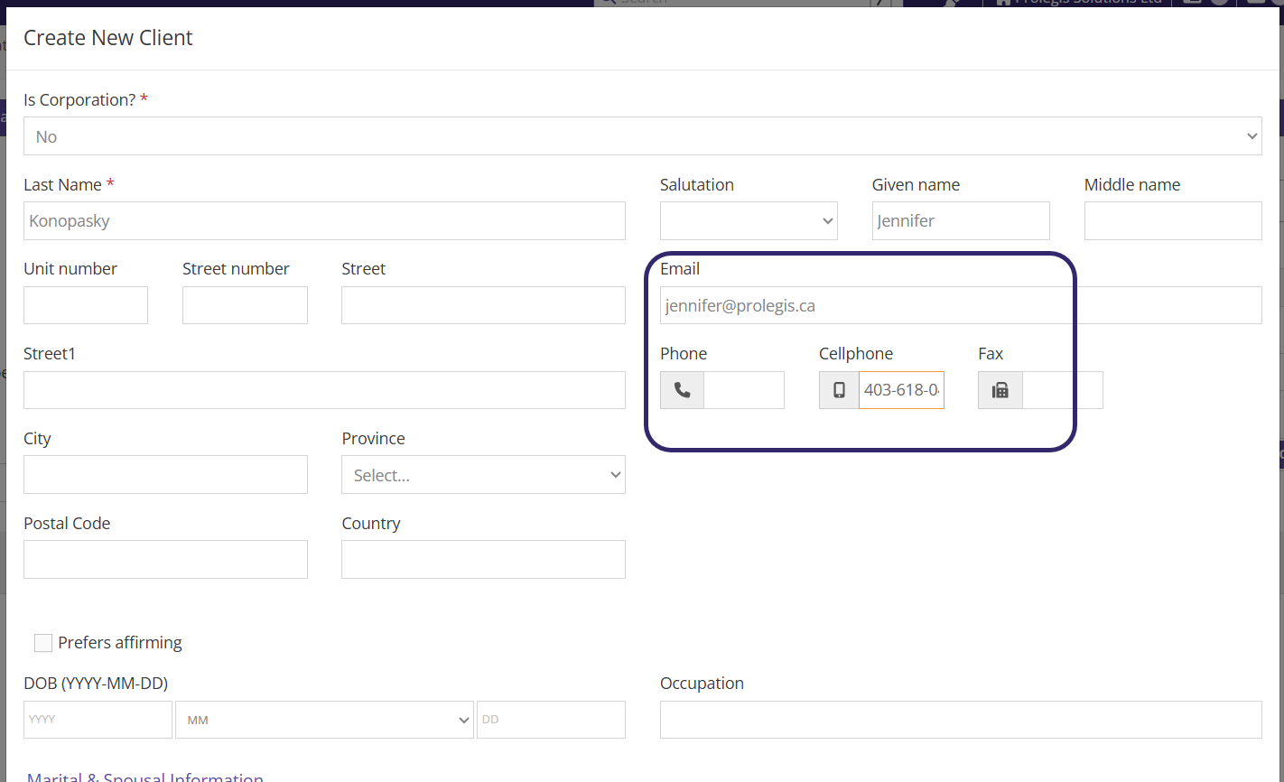 Ensure to include email addresses and cell phone numbers of your clients to quickly send access to the Client Portal / Intake Questionnaire and Electronic ID Verification when the matter is opened.