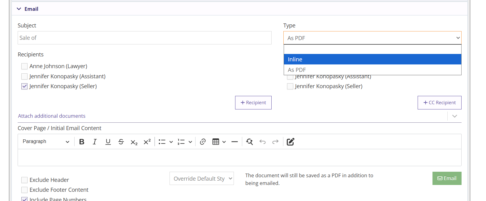 - Under “Type”, change the format to Inline so the letter is the email you are sending.