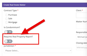 If you toggle on a matter that it requires a Real Property Report, this will generate a step on your matter checklist. This can be done at the time the matter is created