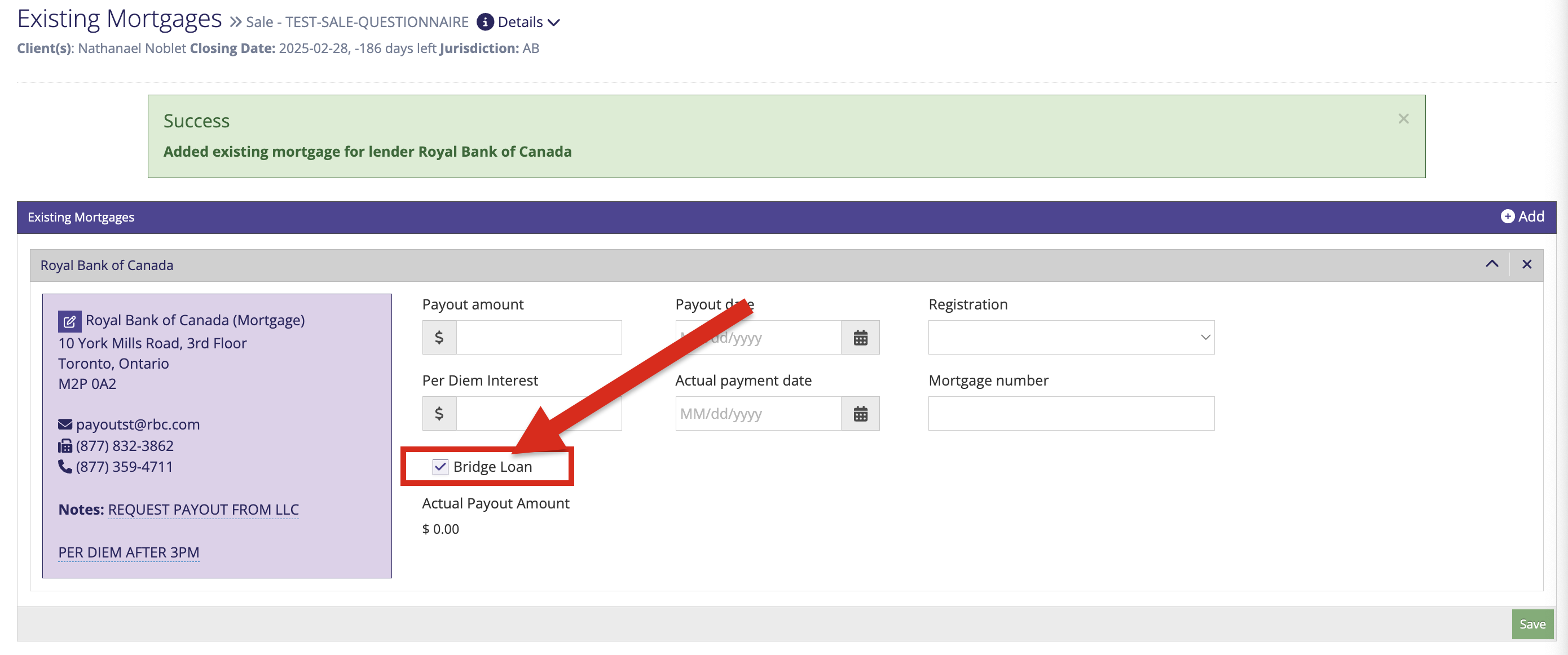 On the sale side of the transaction, you can enter a bridge loan as an existing mortgage to payout, the same way you would for a mortgage registered on title.
