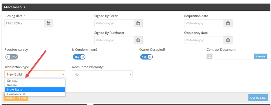 On the Contract Details (AB) and APS (ON) users have an option to select one of three different Transactions Types, New Build, Resale and Commercial.